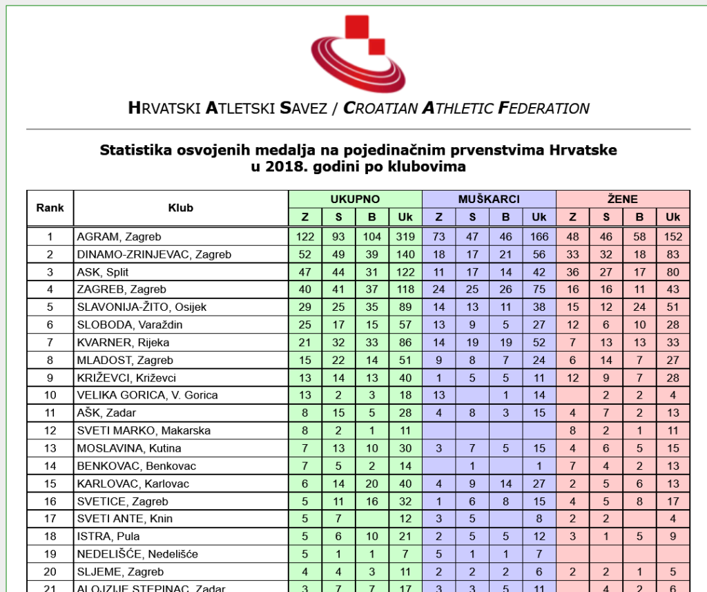 Nakon što je održano i posljednje ovogodišnje domaće atletsko natjecanje u Hrvatskoj, poznat je i konačan broj osvojenih odličja po klubovima na tim natjecanjima.