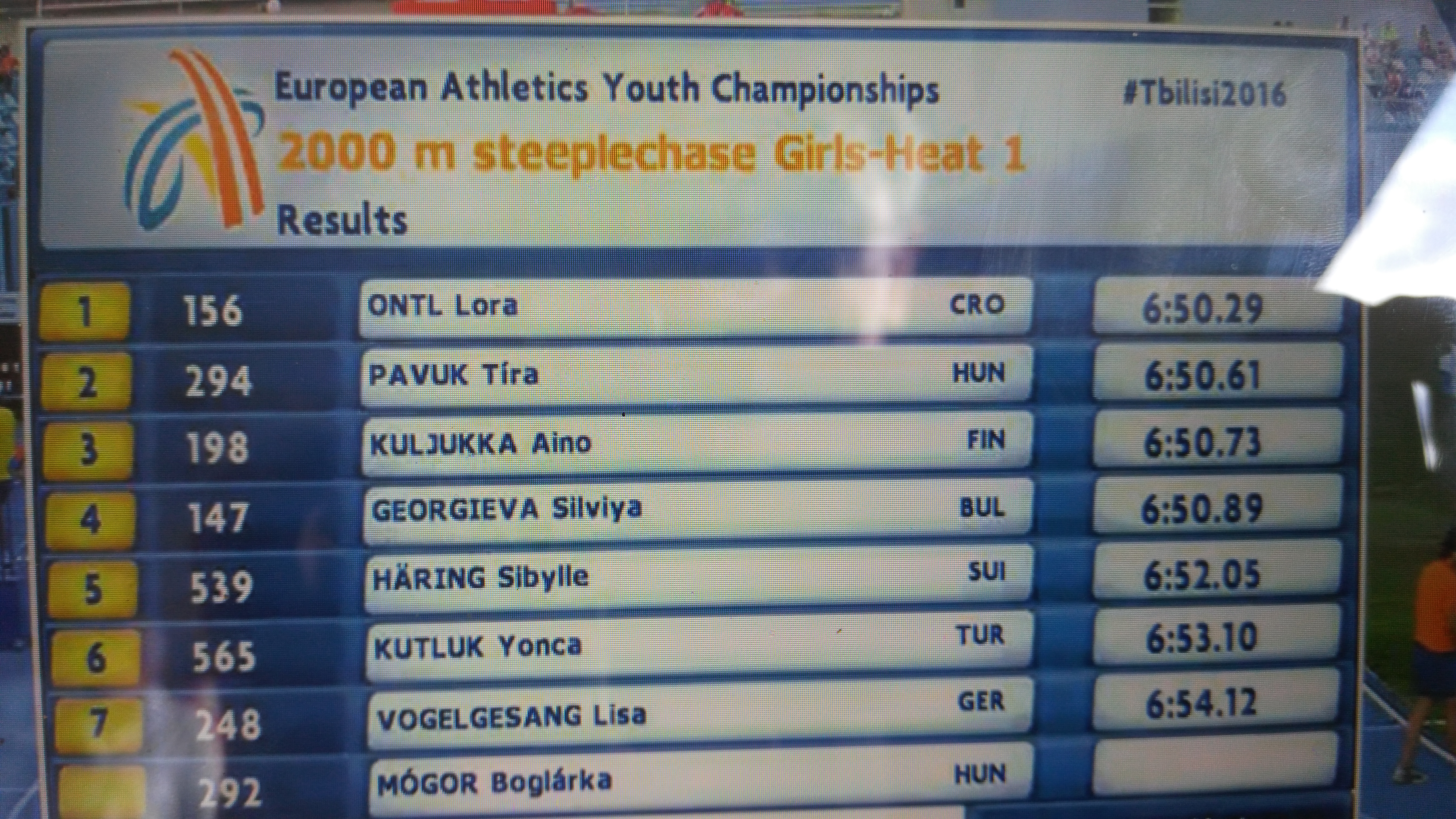 Tbilisi – 14.srpnja 2016. – Sjajna utrka naše mlade rekorderke Lore Ontl na mlađejuniorskom EP u Gruziji. Hrabra i taktički savršena utrka na 2000m zapreke, gdje je Lora od početka do kraja vodila i zasluženo ušla u finale sa pobjedničkih 6:50,29. Ukupno sa trećim rezultatom kvalifikacija prvog dana EP.